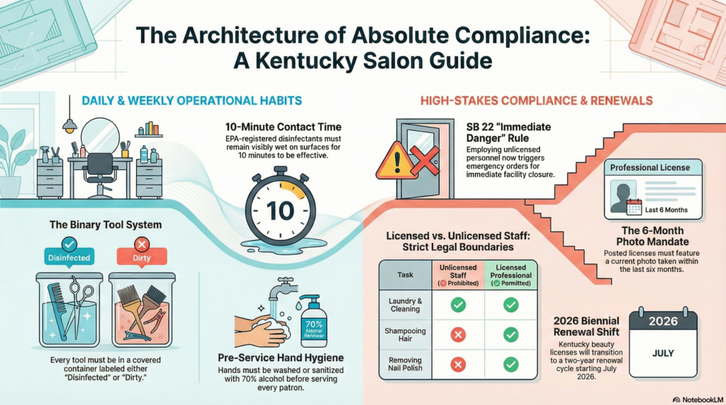 | 201 KAR 12:100 | Sanitation Standards | The “Bible” of infection control; details the specific methods for cleaning and disinfecting tools and surfaces.10 |