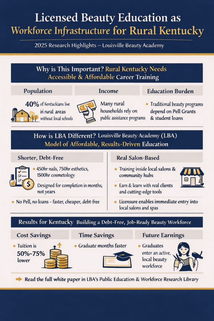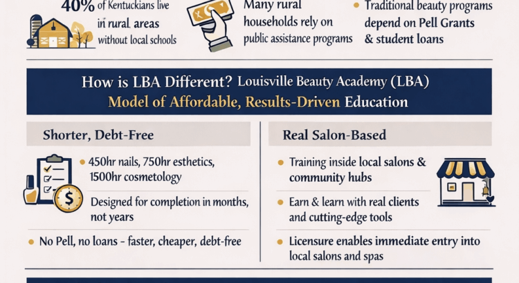 The Louisville Beauty Academy (LBA) model is designed to serve Kentucky’s rural and small-town communities by offering fast, results-driven beauty education that sidesteps traditional financial and bureaucratic barriers. About 85 of Kentucky’s 120 counties are classified as rural (USDA definition), encompassing 1.85 million people (~41% of the state) uknow.uky.edu. These areas face economic challenges – statewide, 18.9% of Kentuckians live in poverty (versus 15.4% nationally), and many rural counties exceed 25% poverty (e.g. Clay – 39.7%, McCreary – 41.0%, Wolfe – 43.0%) kystats.ky.govkystats.ky.gov. Rural Kentuckians rely heavily on public aid (e.g. SNAP, Medicaid) because wages and resources are often low. Median rural incomes lag urban areas, and opportunities for quick, debt-free training are scarce. In this context, traditional beauty schools that depend on federal Pell grants and student loans create hidden costs. Because Pell aid is unavailable for shorter programs (under 600 hours) and only for accredited schools, many rural students end up in longer programs with higher tuition and debtnaba4u.orgnaba4u.org. This forces them to spend extra months in school (reducing earning time) and often graduate with significant loans, even when they only need a shorter vocational credential.