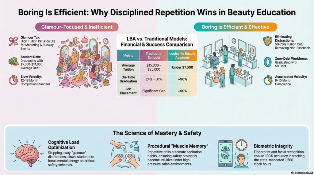 The landscape of vocational education, specifically within the beauty and wellness sector, stands at a critical juncture between two competing pedagogical philosophies. On one side is the traditional, often “glamour-focused” model that prioritizes student engagement through entertainment, artistic flair, and simulated salon environments. On the other is an emerging, outcomes-based model characterized by the phrase “Boring Is Efficient.” This latter philosophy posits that the most effective way to transition a novice into a licensed professional is through a disciplined, repetitive, and compliance-driven curriculum that prioritizes the “safety credential” over aesthetic experimentation.1 In high-stakes industries like cosmetology, where practitioners manage reactive chemicals and utilize invasive sharp instruments, the “boring” elements of education—sanitation, regulatory literacy, and repetitive technical drills—are not merely administrative hurdles but are the essential components of professional survival and public health protection.2 This article provides a comprehensive analysis of this philosophy, using the operational framework of Louisville Beauty Academy (LBA) as a case study to explore how focus, efficiency, and compliance drive faster, safer, and more ethical workforce outcomes.
