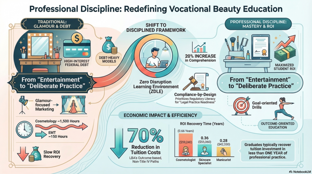 The contemporary landscape of vocational education in the United States is currently navigating a pivotal transition between traditional enrollment-driven models and emerging outcome-oriented frameworks. This research study provides a PhD-level interdisciplinary analysis of the “Professional Discipline Learning Model,” specifically within the context of beauty and personal care licensing. Utilizing the Louisville Beauty Academy (LBA) as a primary case example, the study investigates the structural effectiveness of education that prioritizes technical discipline, regulatory compliance, and economic efficiency over lifestyle-oriented marketing and entertainment-based pedagogy.