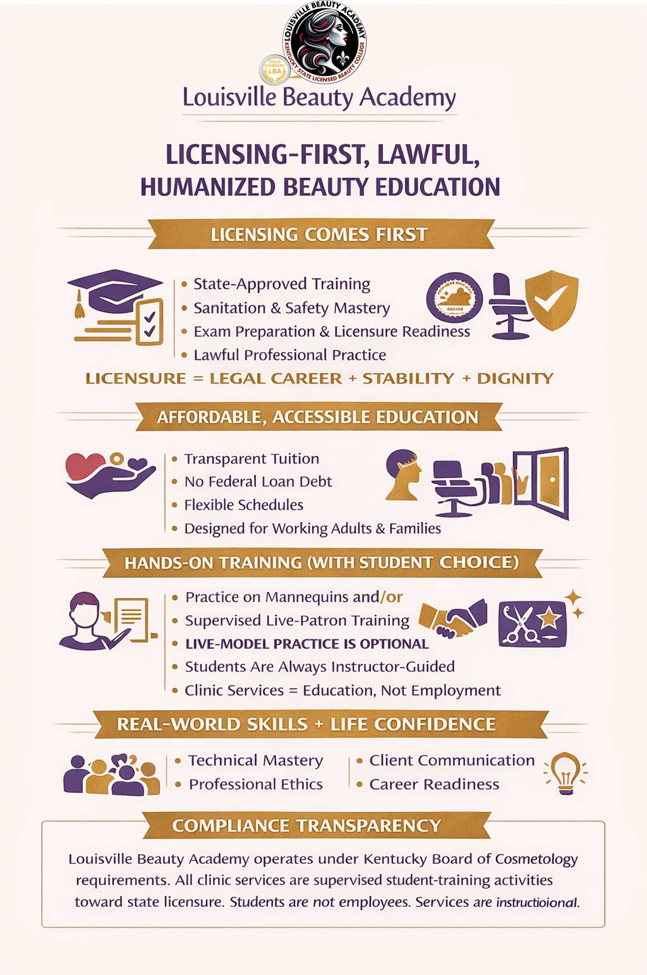 Louisville Beauty Academy operates as a licensed beauty education institution under the requirements of the Kentucky Board of Cosmetology. All student clinic services are performed as part of supervised training toward state licensure. Clinic service fees support educational operations and materials. Students are not employees, and services are instructional in nature. Students may choose to practice on mannequins or supervised live patrons as part of their training.